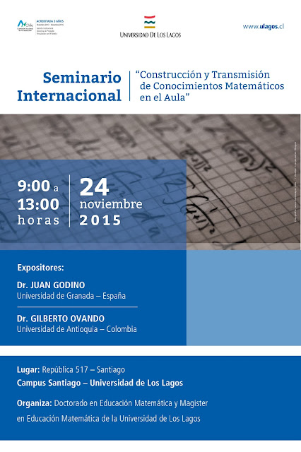 Por este medio comparto con ustedes el Vídeo de las Charlas Dictadas por los Doctores Gilberto Obando (Universidad de Antioquia, Colombia) y Juan D. Godino (Universidad de Granada, España), en el marco de las actividades del Seminario Internacional "Construcción y Transmisión de Conocimientos Matemáticos en el Aula". Las Charlas se titularon, respectivamente, "Regla de tres simple directa: avatares de un algoritmo" y "Articulación de la indagación y transmisión de conocimientos en la enseñanza y aprendizaje de las matemáticas".